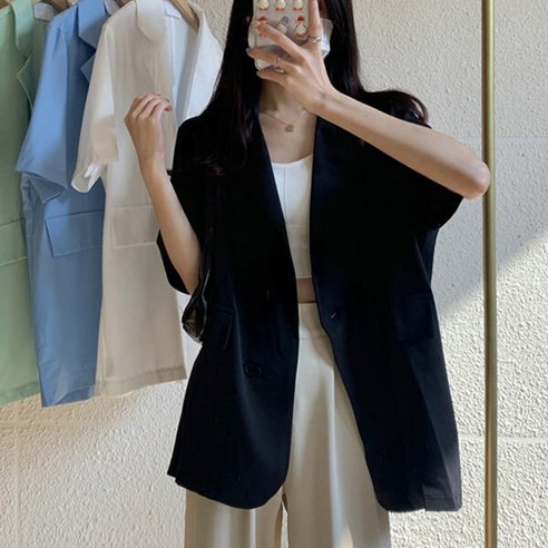 오피스룩 여자 무지 반팔 크롭 정장 자켓 루즈핏 심플 카라넥 버튼 양복 코트